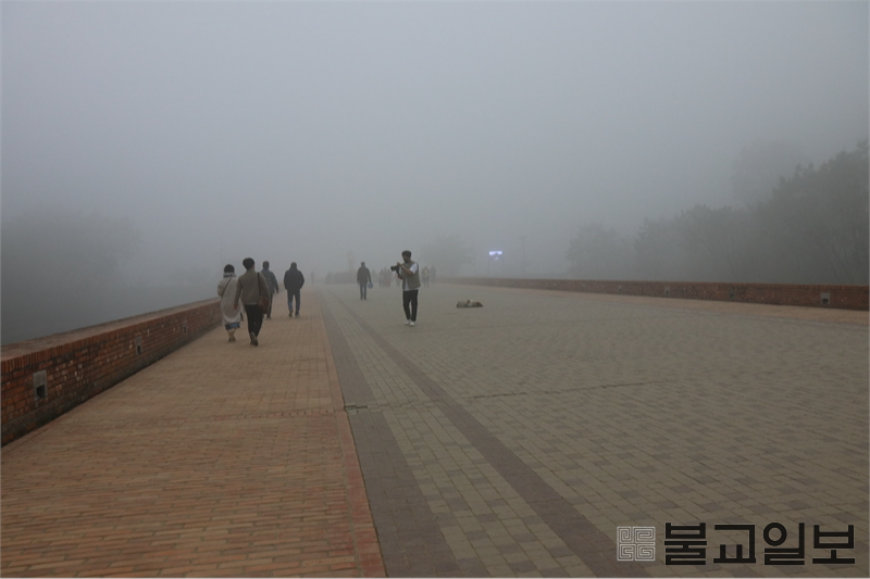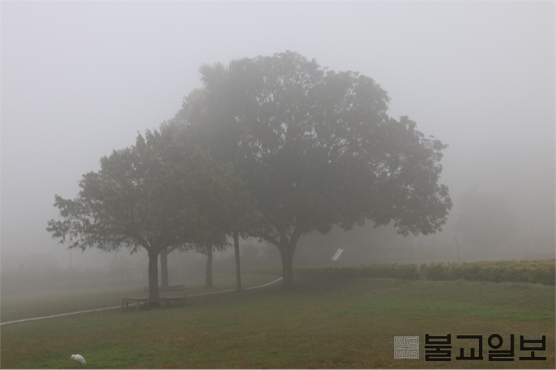룸비니로 향하는 도로는 짙은 안개에 덮여 있었다. 논과 밭, 낮은 숲과 마을은 형체만 남긴 채 희미하게 사라졌다. 도로 위를 미끄러지듯 달리는 버스 창밖으로는 시간의 감각마저 흐려졌다. 이른 아침의 안개는 단순한 자연현상이 아니라, 붓다의 탄생지로 향하는 길목에 드리운 하나의 상징처럼 느껴졌다. 아직 모습을 드러내지 않은 성지를 향해 가는 설렘과 긴장이 동시에 스며들었다.