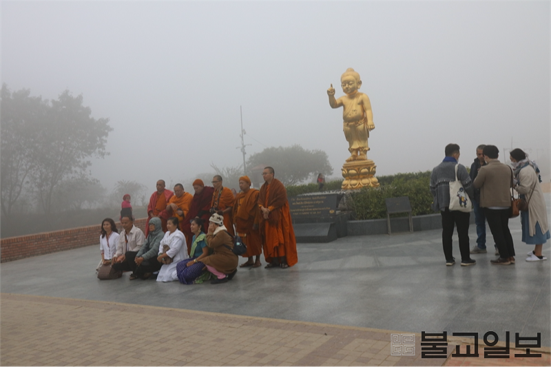 룸비니 입구 아기 붓다상 앞에서 외국 순례자들