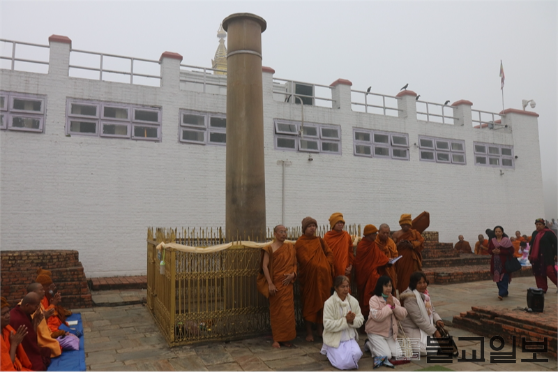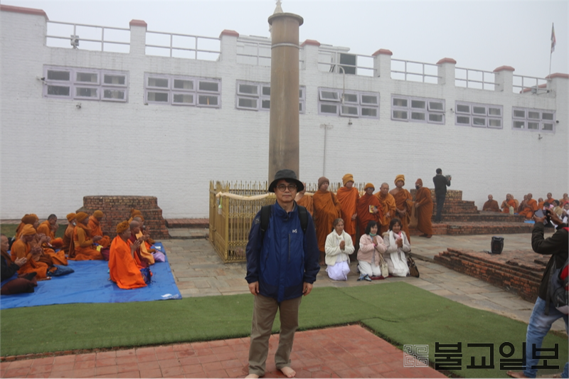 아쇼카 석주 앞에서 불교일보 성불 기자