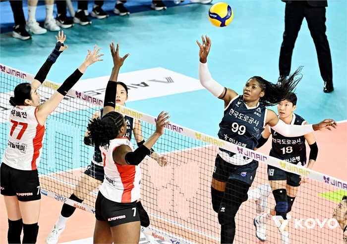 공격하는 한국도로공사의 모마(오른쪽) [한국배구연맹 제공. 재판매 및 DB 금지]
