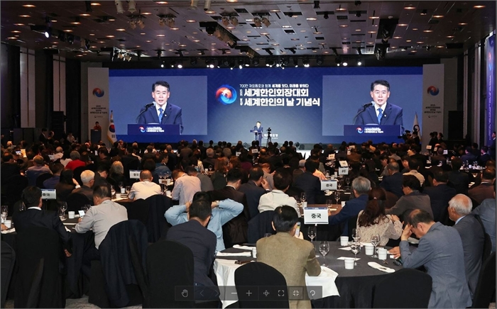 2025 세계한인회장대회서 폐회사 하는 김경협 청장 김경협 재외동포청장이 지난 10월 1일 서울 그랜드 워커힐 호텔에서 열린 2025 세계한인회장대회 폐막식에서 폐회사를 하고 있다. [재외동포청 제공]