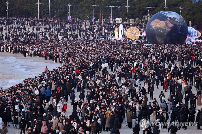 해운대 해맞이 인파 (부산=연합뉴스) 손형주 기자 = 1일 오전 부산 해운대해수욕장에서 병오년 첫해를 보기 위해 많은 시민들이 모여 있다. 2026.1.1 handbrother@yna.co.kr
