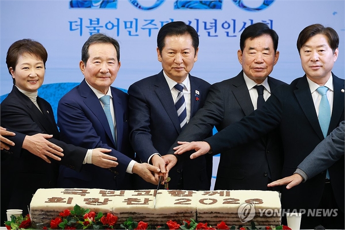 더불어민주당 신년인사회 (서울=연합뉴스) 신현우 기자 = 더불어민주당 정청래 대표가 새해 첫날인 1일 서울 여의도 중앙당사 당원존에서 열린 신년인사회에 참석해 떡케이크를 자르고 있다. 왼쪽부터 이언주 최고위원, 상임고문인 정세균 전 국무총리, 정 대표, 상임고문인 김진표 전 국회의장, 황명선 최고위원. 2026.1.1 nowwego@yna.co.kr
