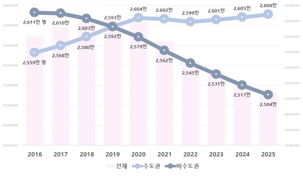 수도권 인구(2천608만1천644명)는 2024년보다 3만4천121명(0.13%) 증가했지만, 비수도권 인구(2천503만5천734명)는 13만3천964명(0.53%) 감소했다.