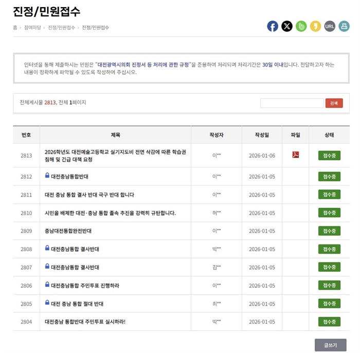 한편 대전시의회 게시판에는 지난해 12월 21일부터 접수된 통합 반대 관련 진정이 740건을 넘었다.