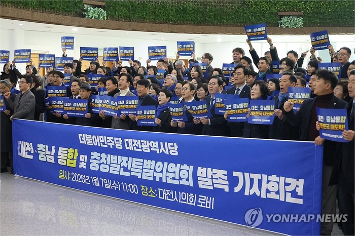 더불어민주당 대전충남통합특별위 발족 (대전=연합뉴스) 이주형 기자 = 더불어민주당 대전시당 관계자들이 7일 대전시의회 앞에서 '더불어민주당 대전광역시당 대전충남통합 및 충청 발전특별위원회' 발족 기자회견을 열고 있다. 2026.1.7 coolee@yna.co.kr