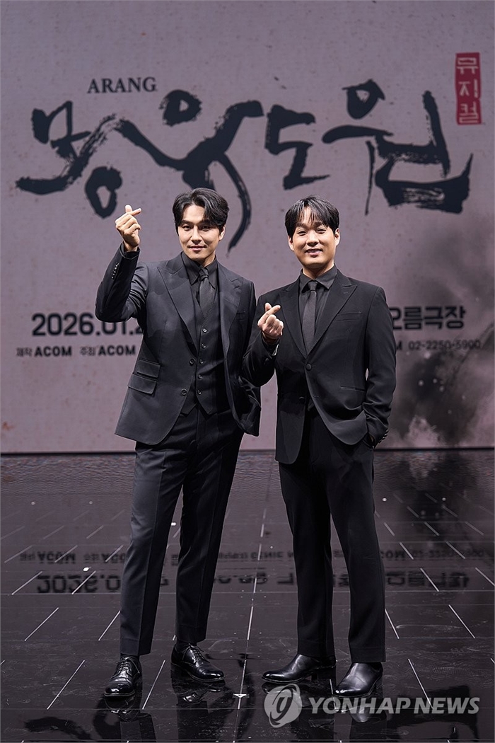 뮤지컬 '몽유도원' 제작발표회 (서울=연합뉴스) 7일 화성예술의전당 동탄아트홀에서 열린 뮤지컬 '몽유도원' 제작발표회에서 민우혁(왼쪽)과 김주택이 포즈를 취하고 있다. 2026.1.7 [에이콤 제공. 재판매 및 DB 금지] photo@yna.co.kr